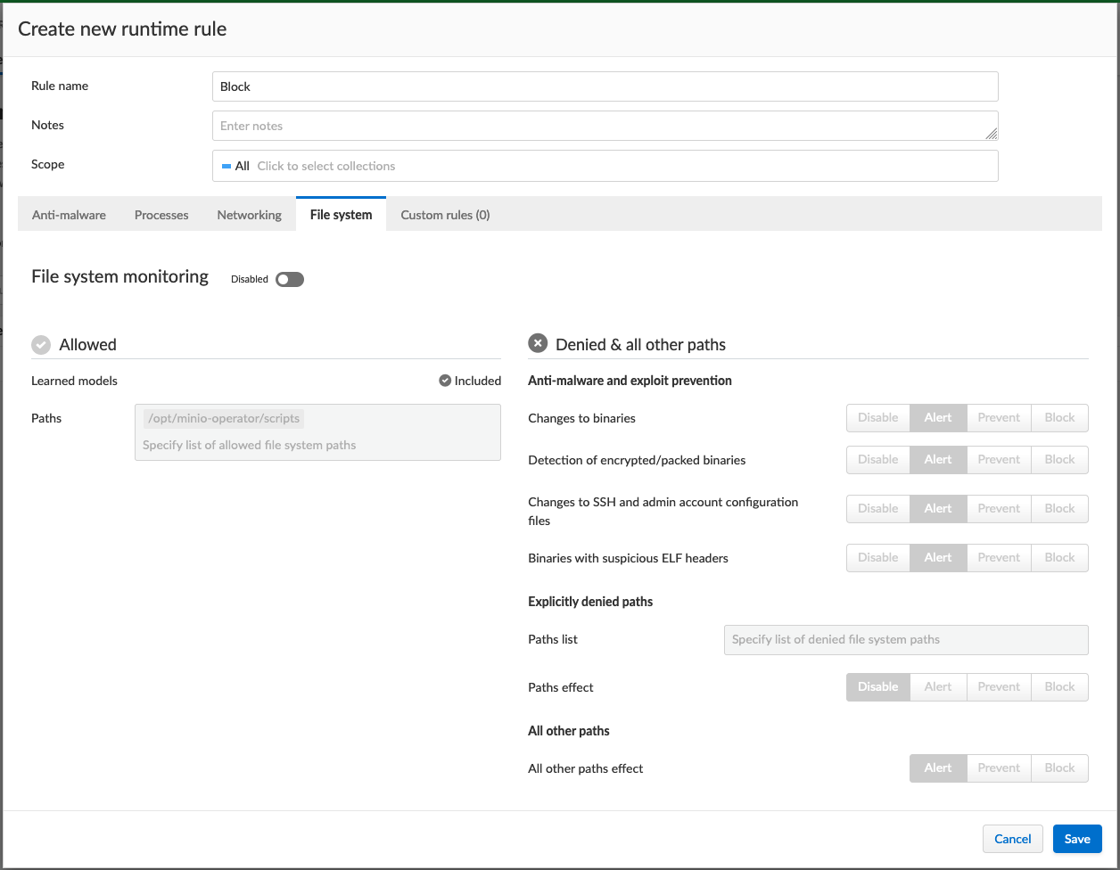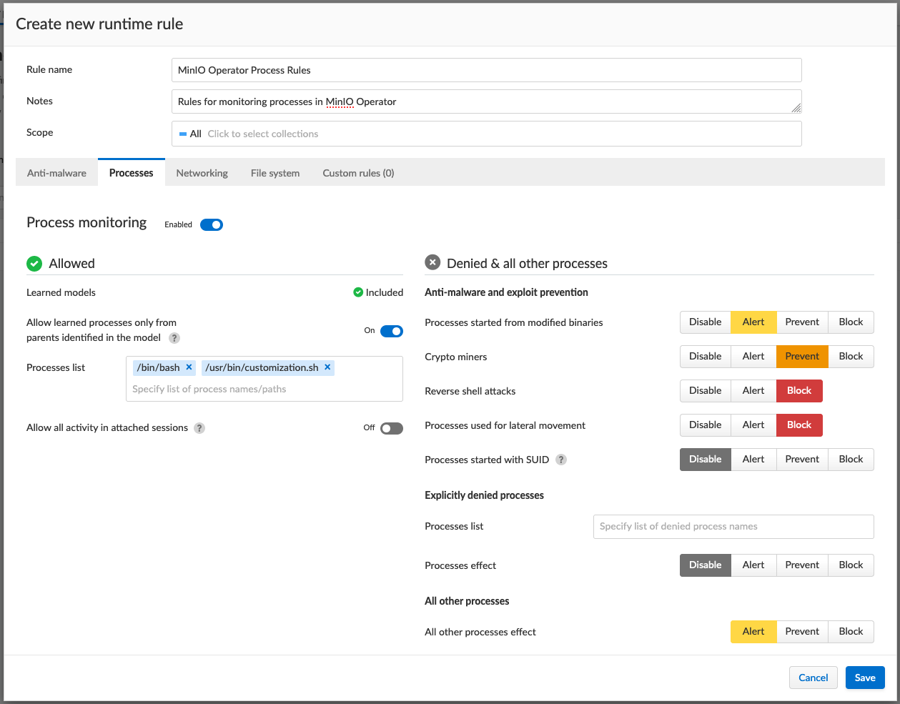 You can create custom rules which run alongside Container Models by defining Container Runtime Policies. These policies act as additional rules which take action, such as blocking or alerting, when certain behaviors are detected.